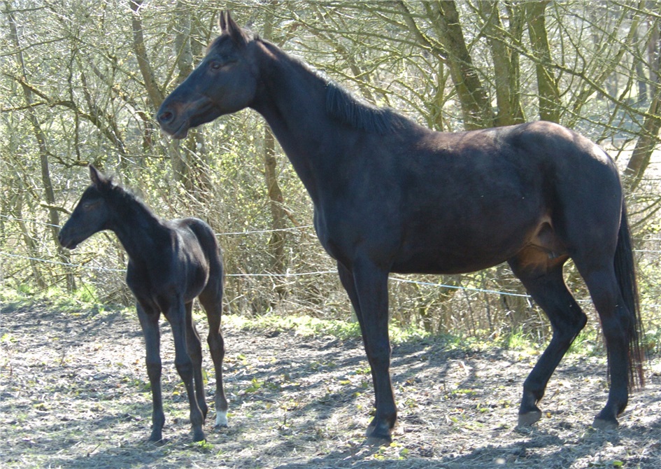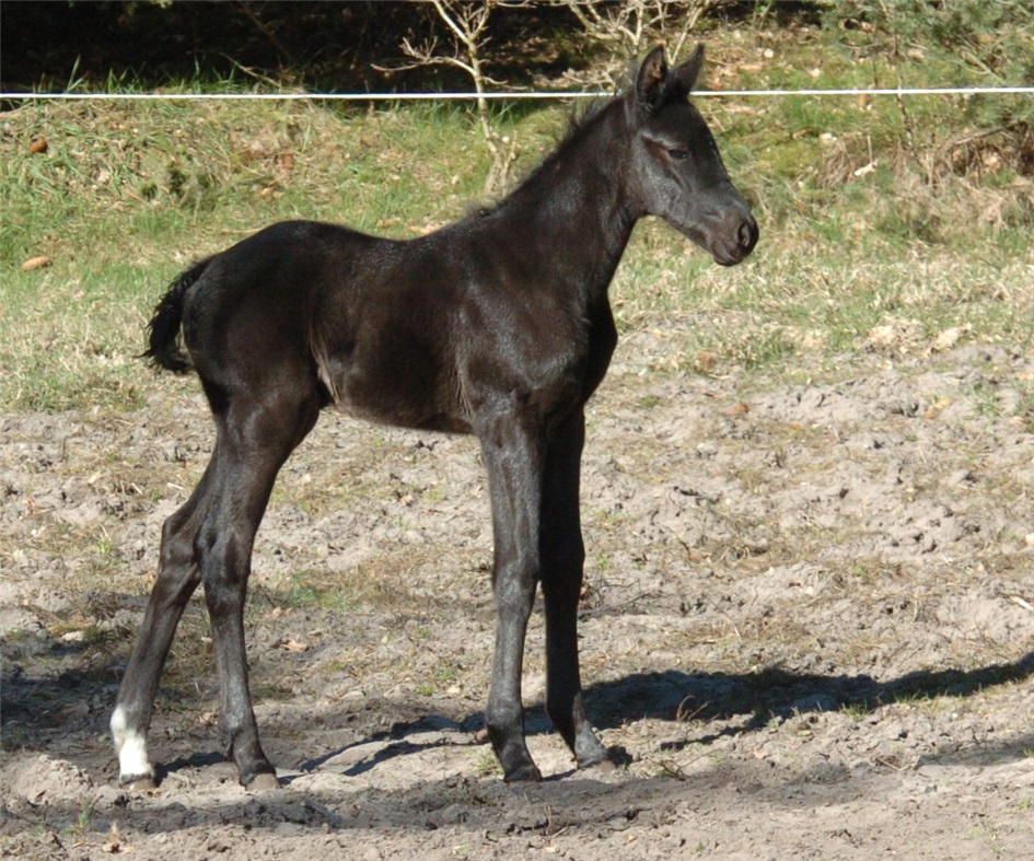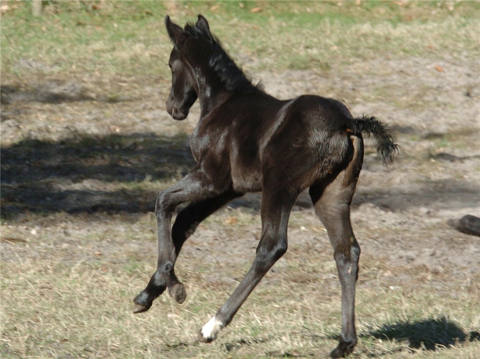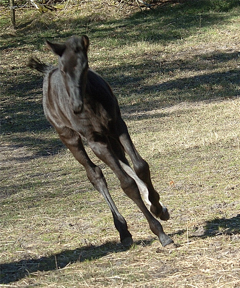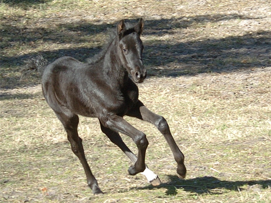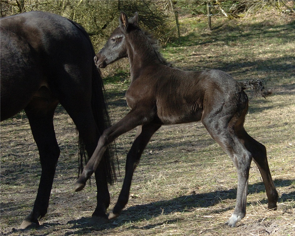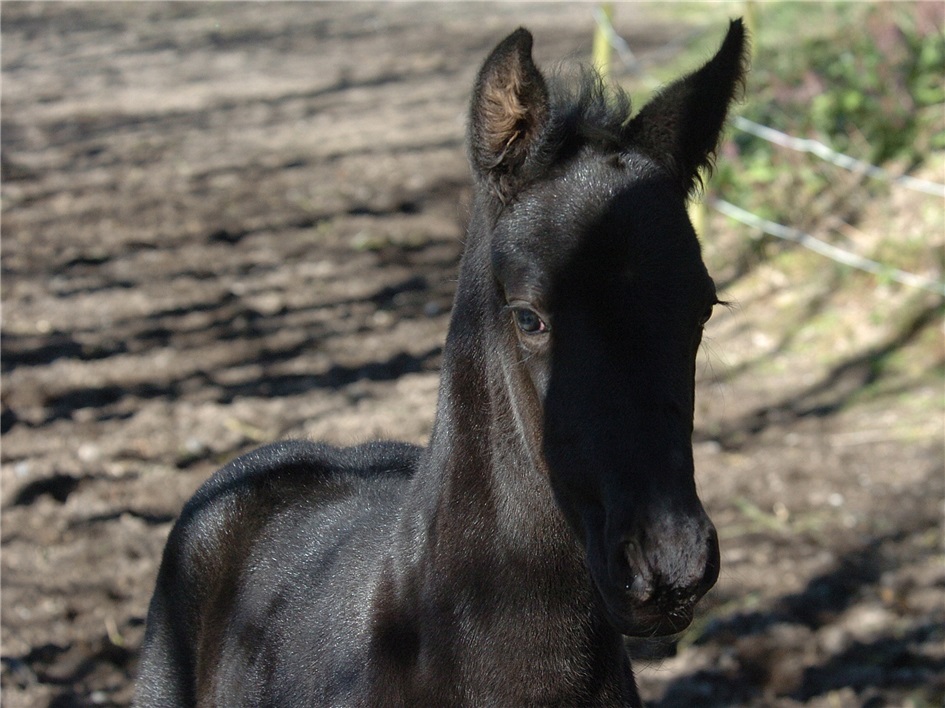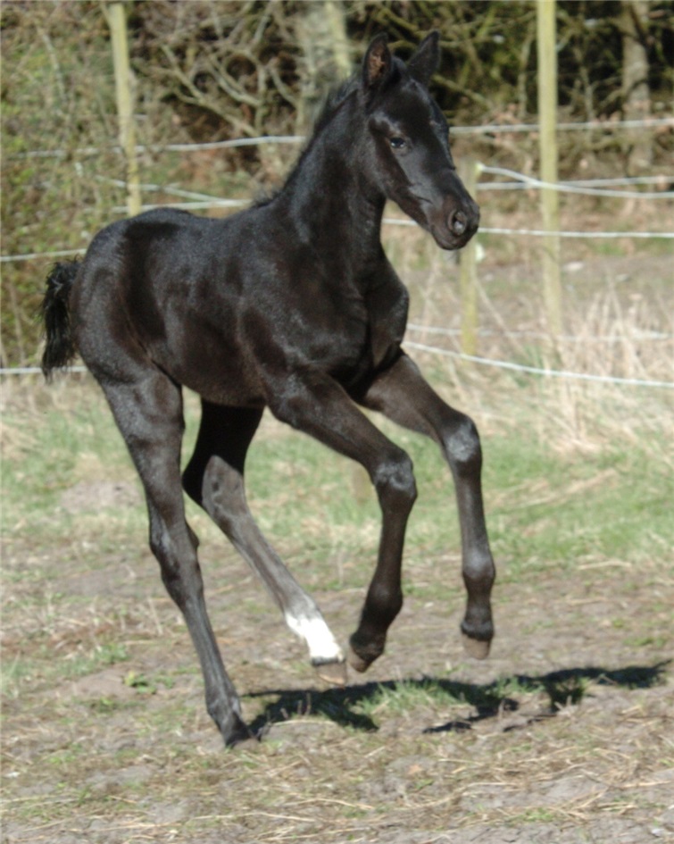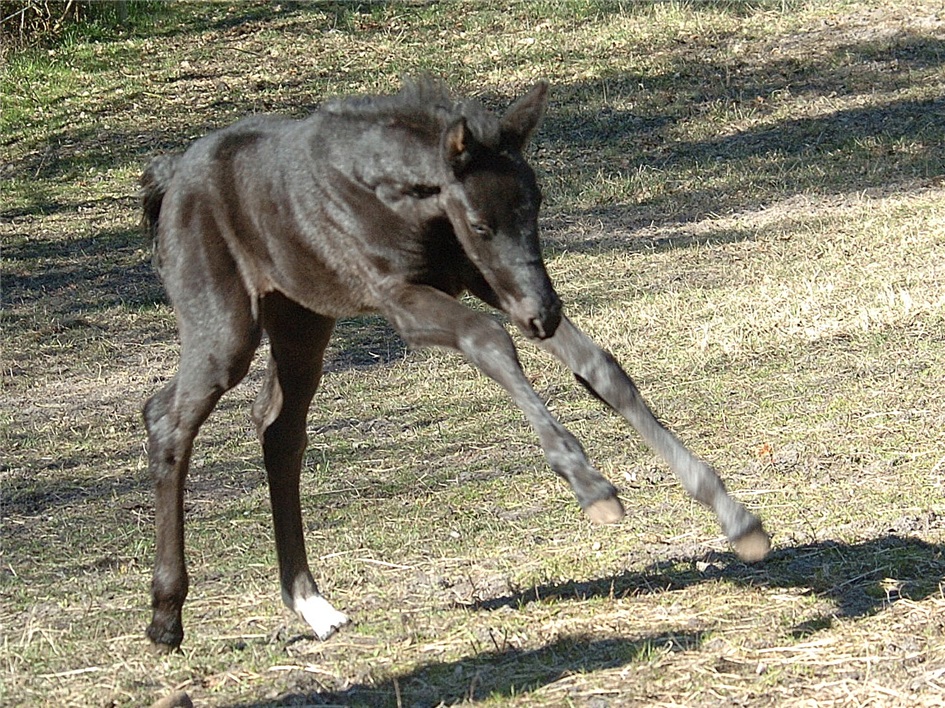 Sort hoppeføl med gå på mod og charme. Foto 10 dage gammel.