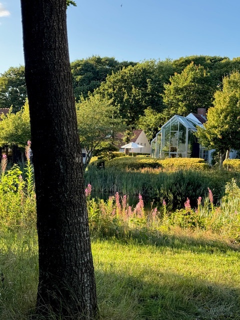 Natur- og haveoplevelserne er struktureret af point de vue akser og krydret med Vibeke Gaard`s fantasifulde og frodige stentøjsskulpturer indpasset i beplantninger og i overraskende events.