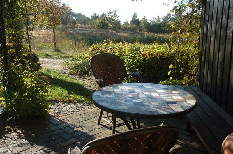 Væksthusets træfacade mod øst er forlænget med terrasseanlæg med keramisk bord (Henrik Thorhauge) overdækket med et grønt løvtag.